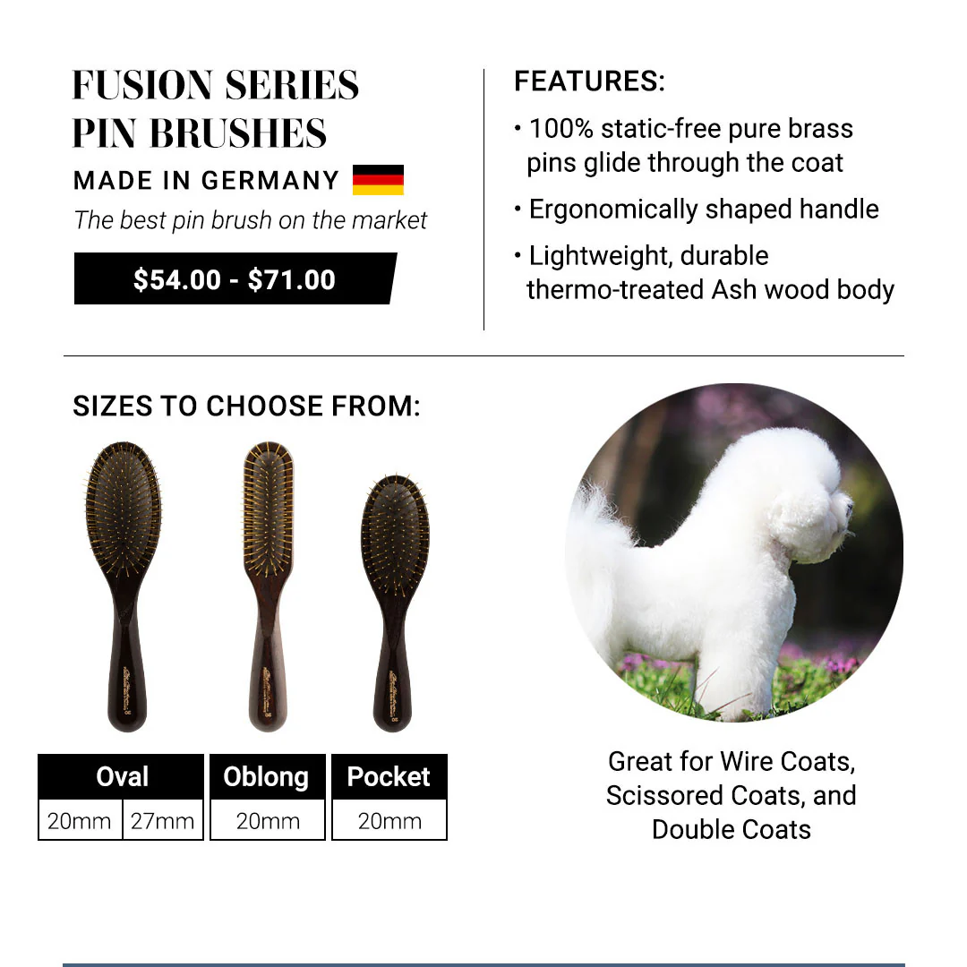 The Chris Christensen Fusion brush is for those who demand quality and perfection! This brass pin brush is 100% static-free and glide through the coat with ease! 30% more pins than regular pin brushes, producing a finer brush stroke. The ergonomic handle feels wonderful!