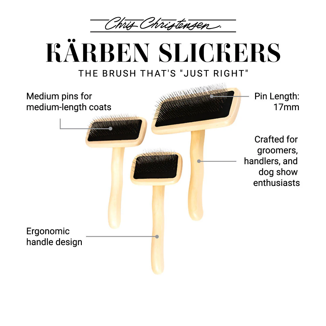 The Kärben Slicker brush by Chris Christensen is expertly crafted to cater to the needs of Groomers, Handlers, Dog Show Enthusiasts, and Pet Owners aiming for an effective tool to manage the integrity of the coat. Kärben Slicker Brushes are perfect for removing tangles, matts, shedding coat, and debris, while keeping coats well maintained to prevent impacted matting which could lead to irritation on the skin. May also be used to fluff the coat, along with brushing out thick, dense, coat types. Available in our three most popular brush sizes, Kärben Slickers feature an ergonomic handle and 17mm pin length with high-quality stainless steel pins nested within a stylish black pin pad.