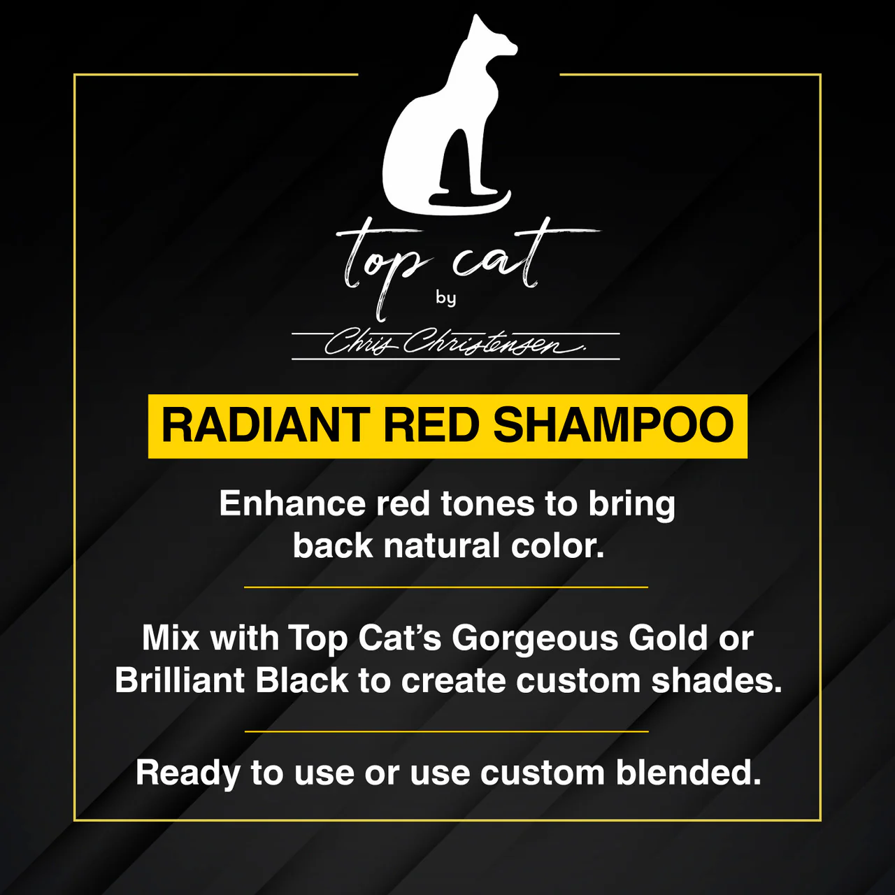 Chris Christensen Top Cat Radiant Red Shampoo is an optic intensifying treatment within a shampoo designed to enrich red tones and bring the coat back to it's natural color without the use of harsh or caustic chemicals. DO NOT USE Radiant Red on coats that are lighter than the product, instead mix it with Gorgeous Gold or Brilliant Black to create a custom shade for you cat's coat.