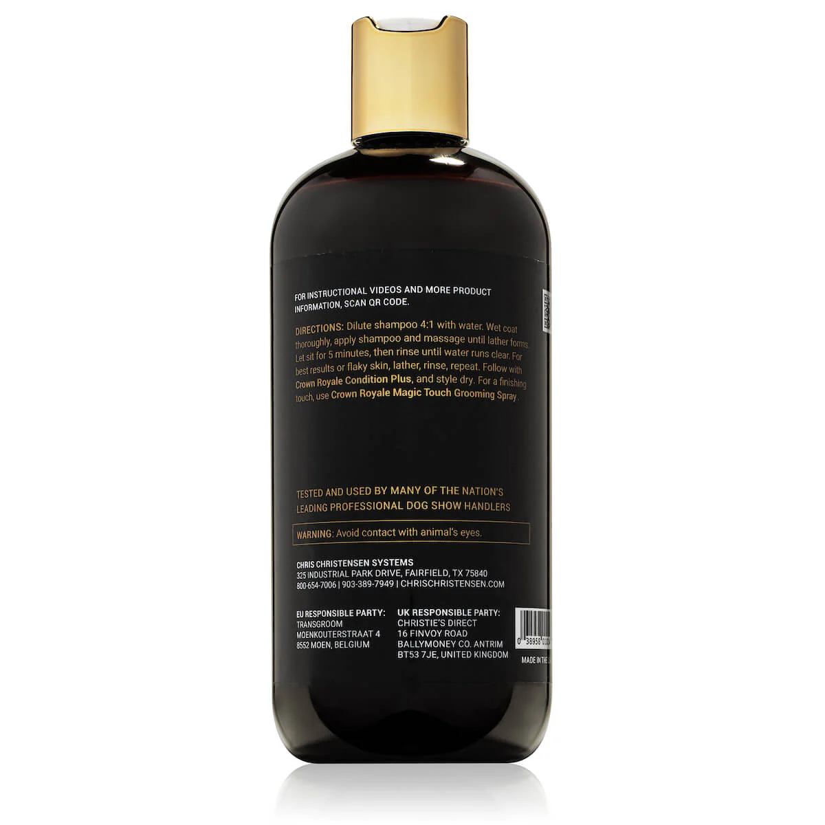 Directions: Dilute shampoo 4:1 with water. Wet coat thoroughly, apply shampoo and massage until lather forms. Let sit for 5 minutes, then rinse until water runs clear. For best results or flaky skin, lather, rinse, repeat. Follow with Crown Royale Condition Plus and style dry. For a finishing touch, use Crown Royale Magic Touch Grooming Spray.
